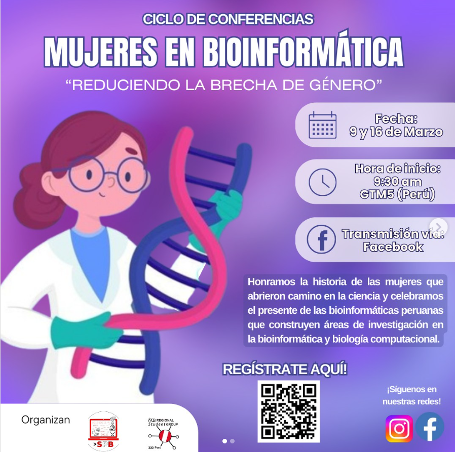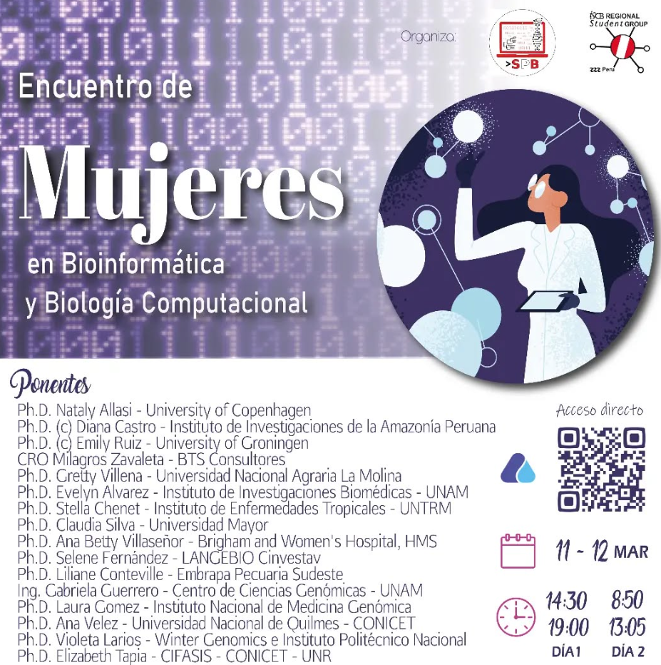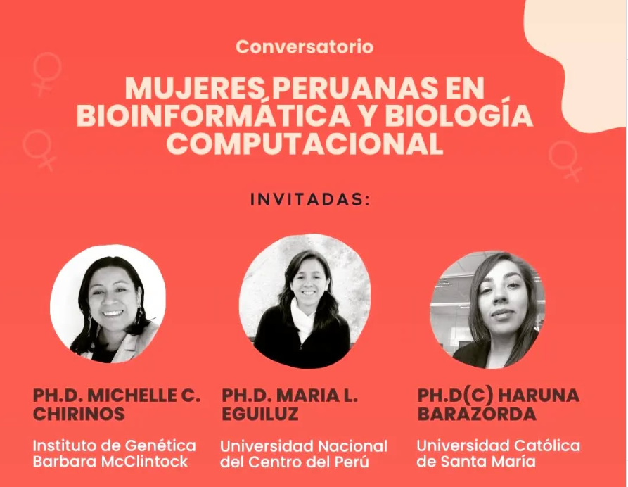 La SPBBC y RSG Perú realizaron, el 10 de marzo a las 18:00 (GMT-5) y en modalidad virtual, un conversatorio para visibilizar el aporte de las científicas peruanas y fomentar vocaciones en STEM. Participaron como invitadas Ph. D. Michelle C. Chirinos (Instituto de Genética Bárbara McClintock), Ph. D. María L. Eguiluz (Universidad Nacional del Centro del Perú) y Ph. D (c) Haruna Barazorda (Universidad Católica de Santa María). Se abordaron experiencias en genómica, bioinformática aplicada y biología computacional, así como retos de formación y liderazgo. La dinámica combinó presentaciones breves y preguntas del público. El evento fortaleció la red entre estudiantes y profesionales, generó referentes femeninos y promovió colaboraciones para impulsar la bioinformática en el Perú.