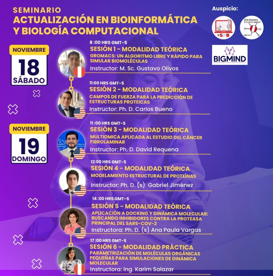 La SPBBC y RSG Perú organizaron el Seminario de Actualización en Bioinformática y Biología Computacional, realizado virtualmente el 18–19 de noviembre de 2023. Fueron seis sesiones teórico-prácticas con especialistas de referencia: GROMACS para simulación de biomoléculas (M. Sc. Gustavo Olivos); predicción de estructuras con campos de fuerza (Ph. D. Carlos Bueno); multiómica en cáncer fibrolaminar (Ph. D. David Requena); modelamiento estructural de proteínas (Ph. D. Gabriel Jiménez); docking y dinámica molecular contra la proteasa principal del SARS-CoV-2 (Ph. D. Ana Paula Vargas); y parametrización de moléculas orgánicas (Blg. Karin Salazar). El seminario convocó a estudiantes y profesionales de diversos países latinoamericanos, consolidándose como un espacio clave de capacitación en bioinformática y biología computacional.